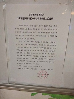 关于推荐刘勇同志 作为评选滨